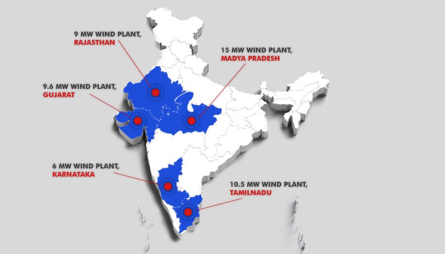 The Company has seven wind farms in Karnataka Rajasthan, Tamilnadu, Gujarat, and Madhya Pradesh with a consolidated wind energy generation capacity of 50.1 megawatts.